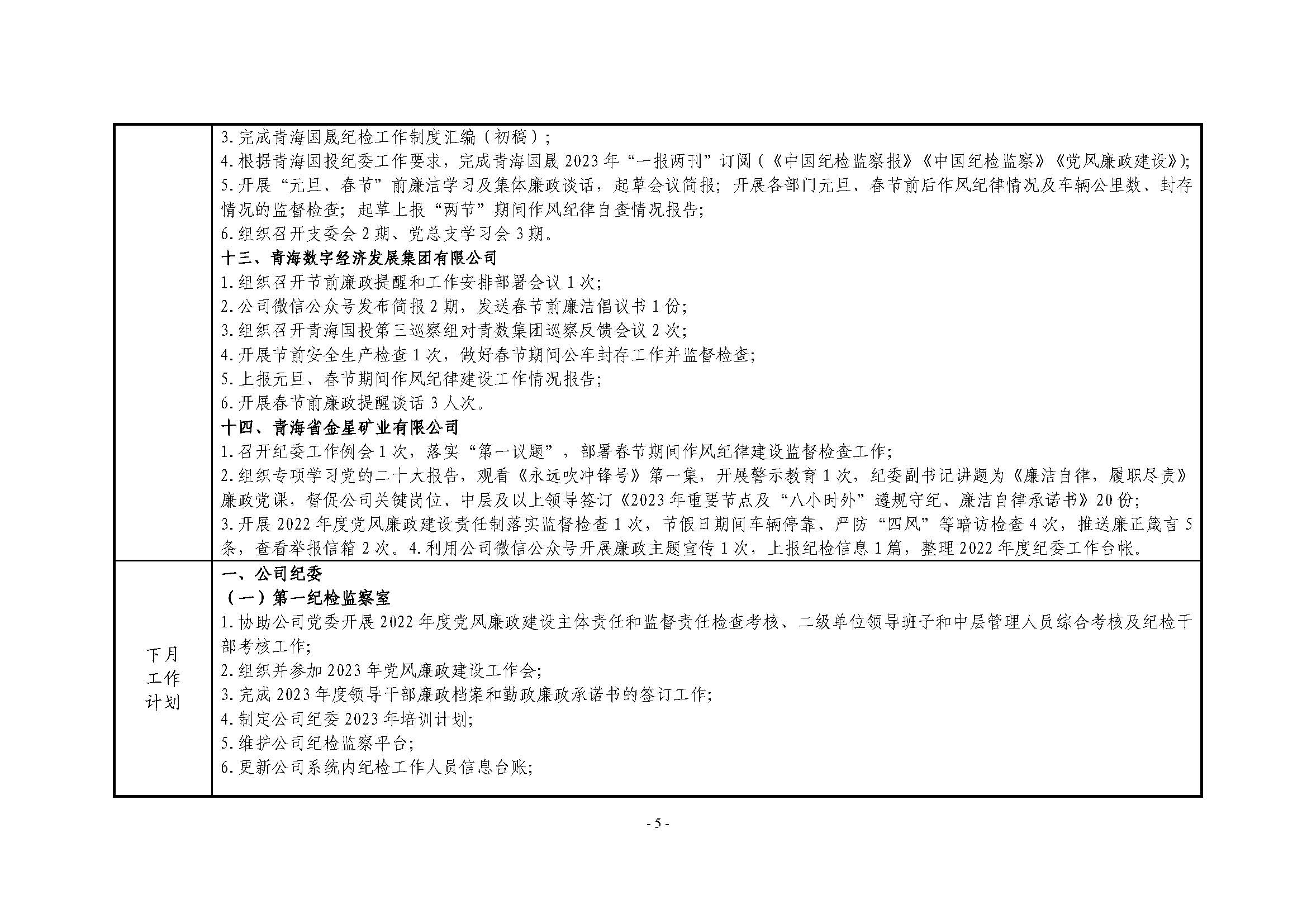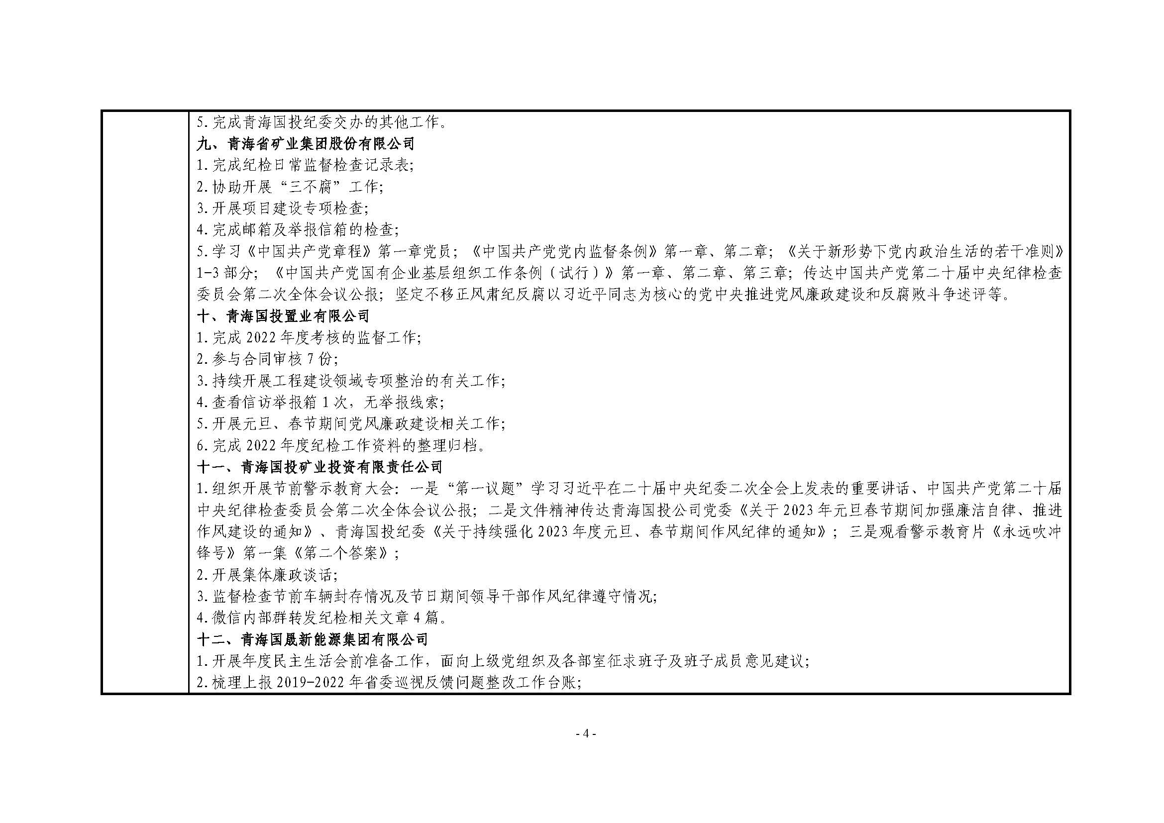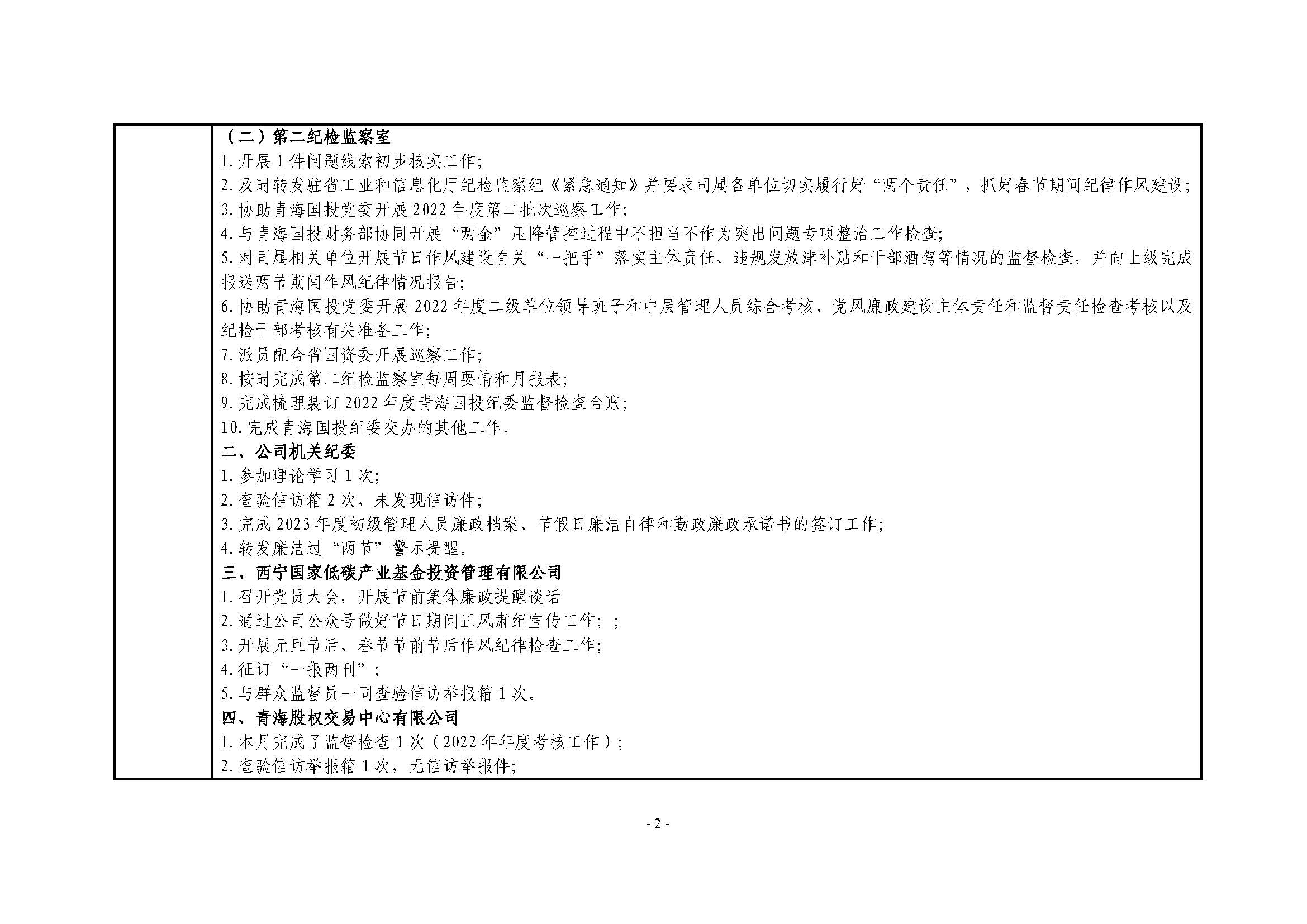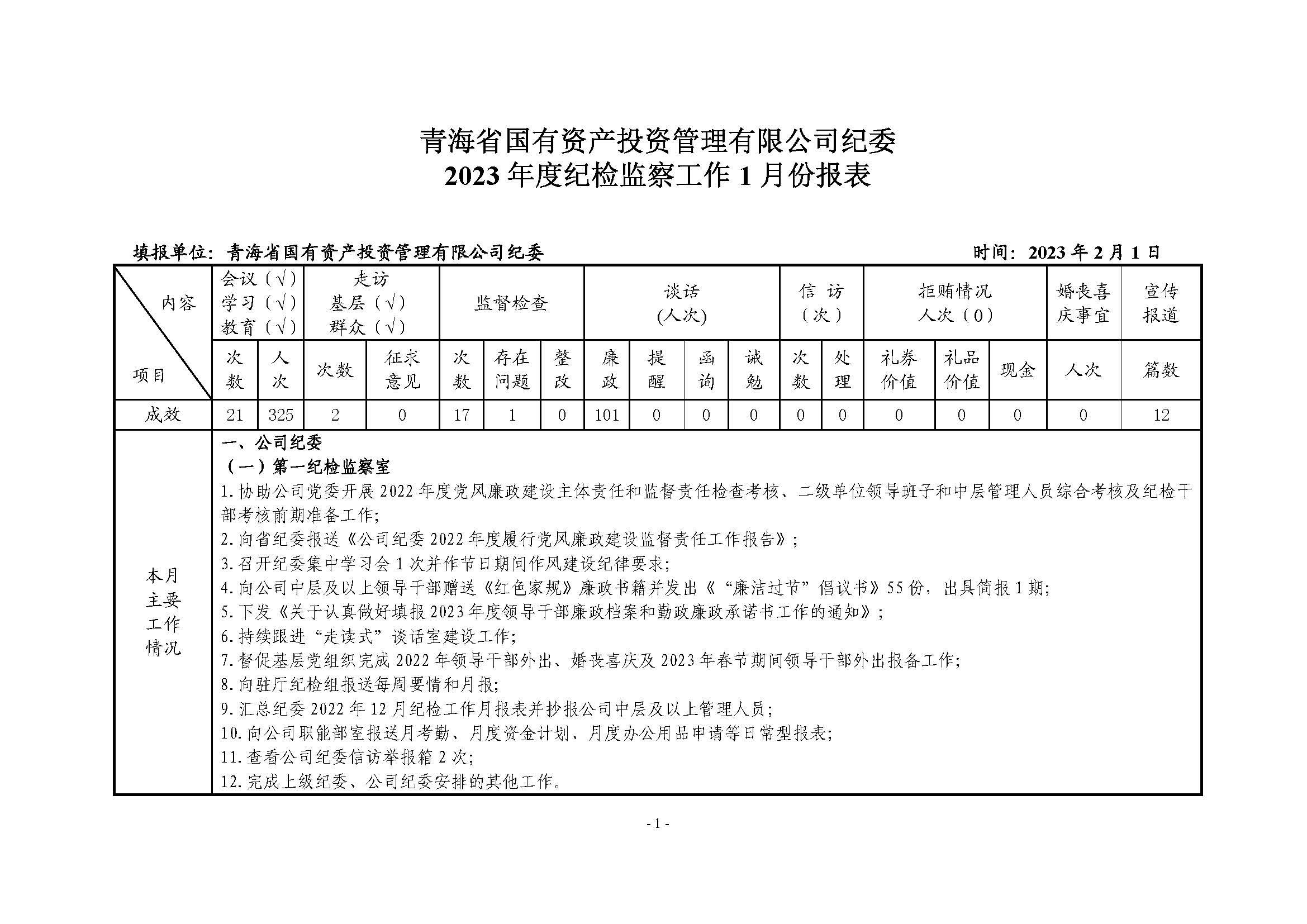 青海国投纪委2023年度纪检监察工作1月份报表