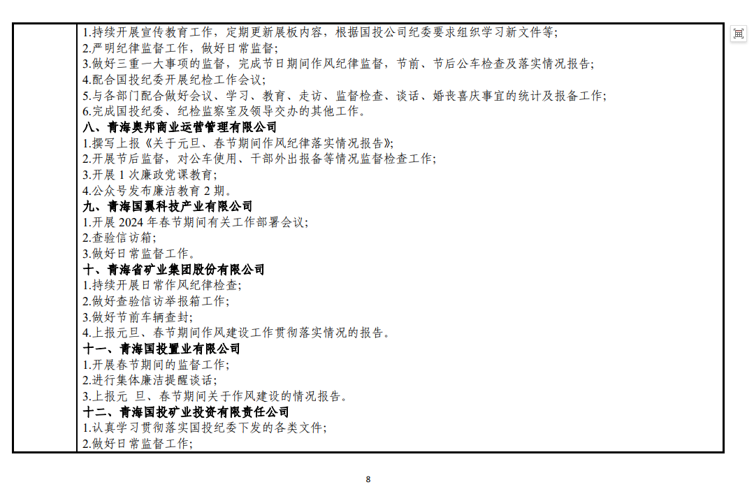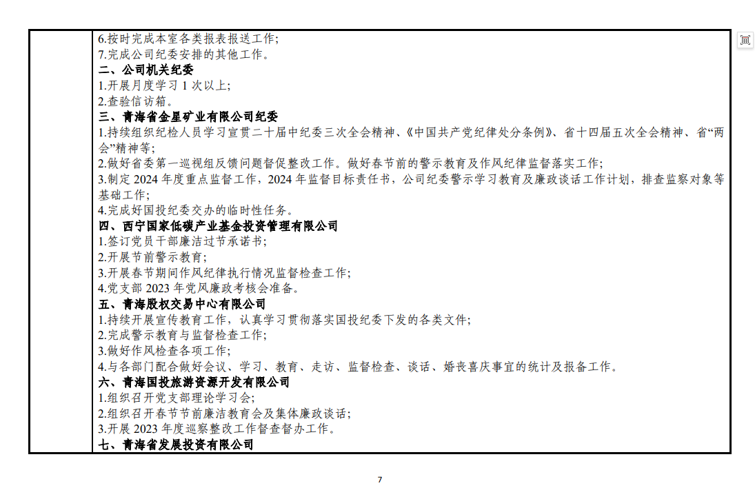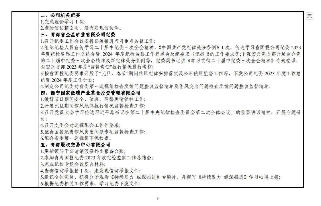 青海国投纪委2024年度纪检监察工作2月份报表
