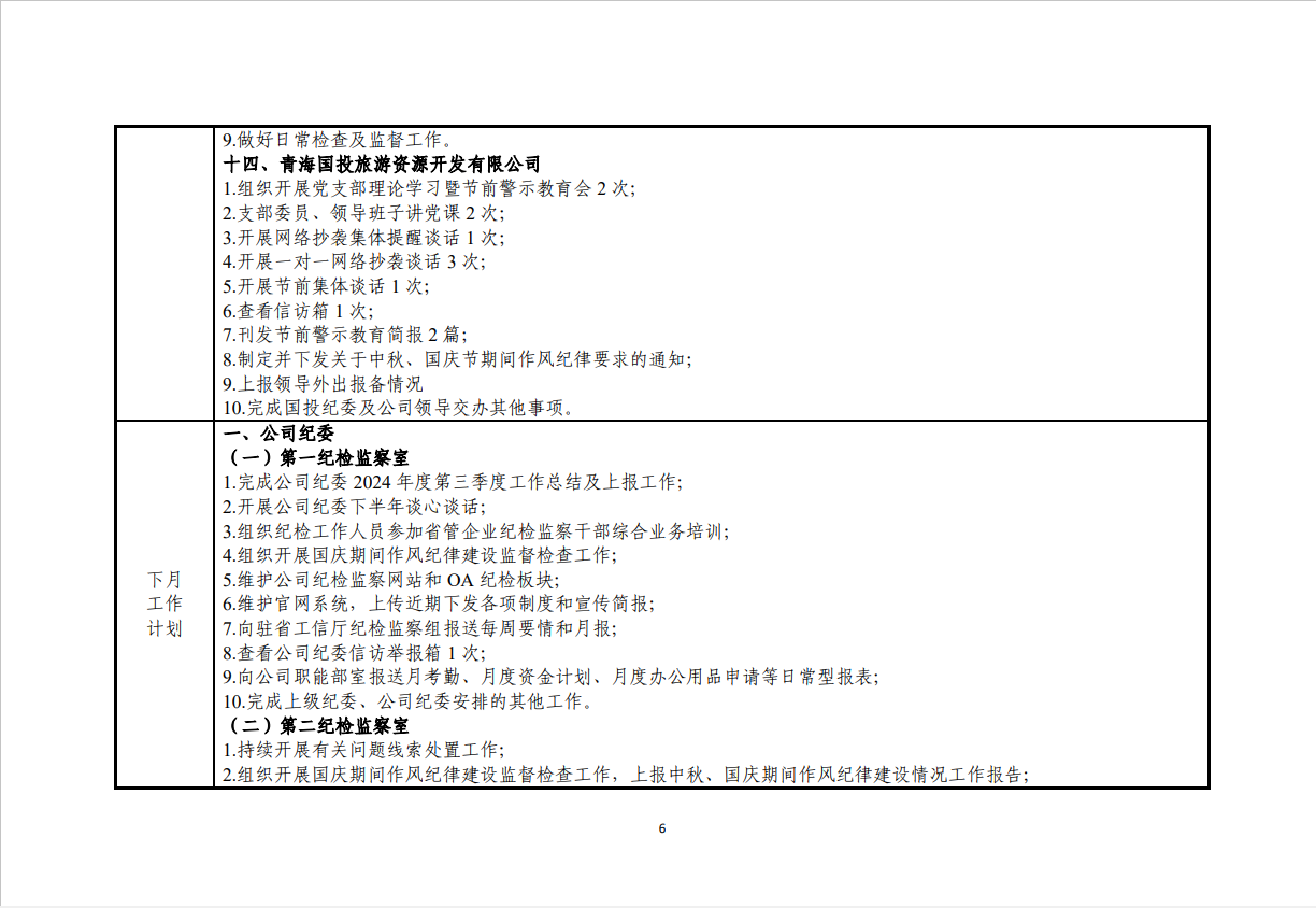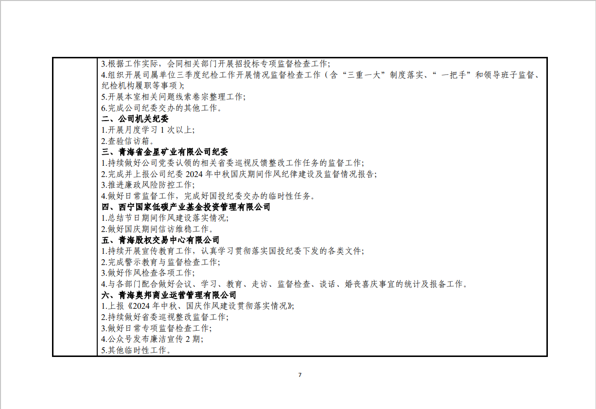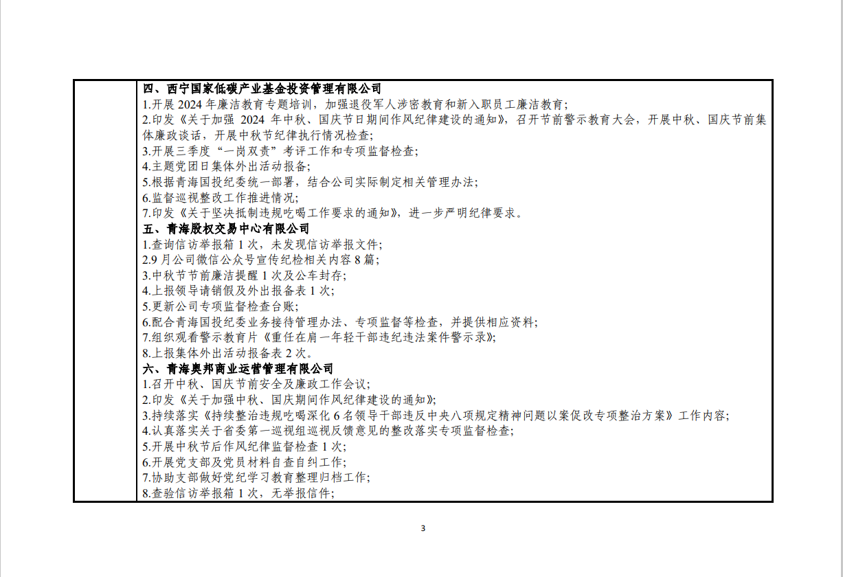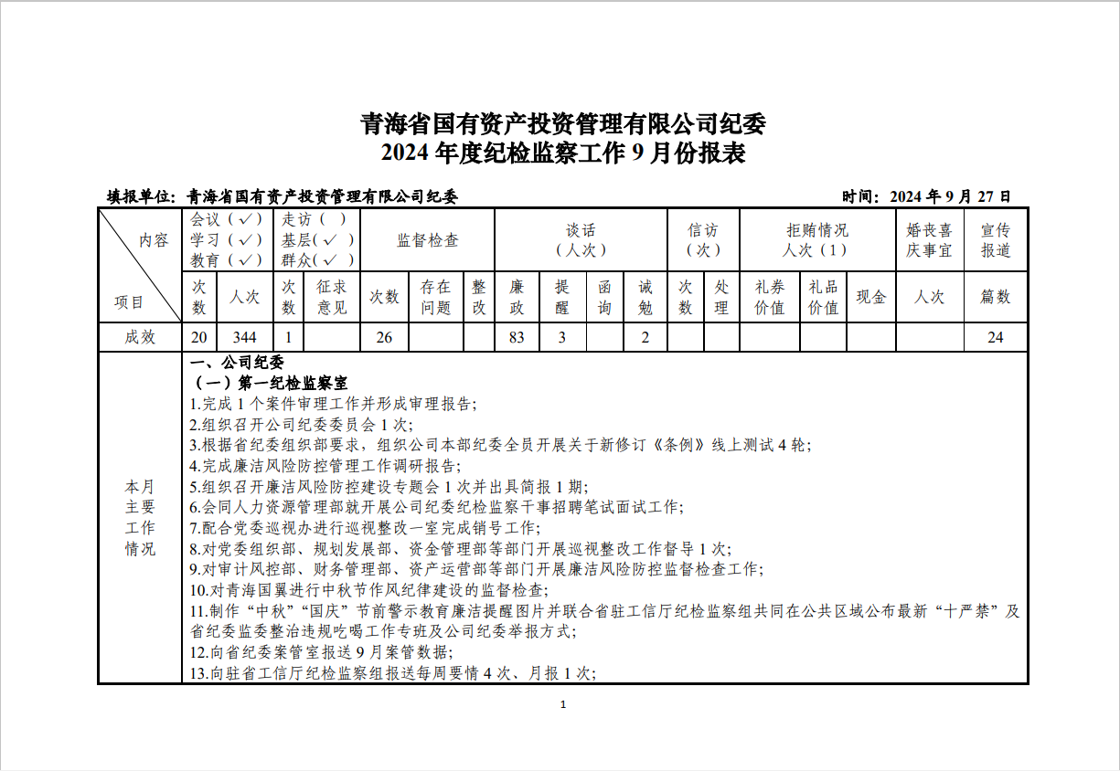 青海国投纪委2024年度纪检监察工作9月份报表