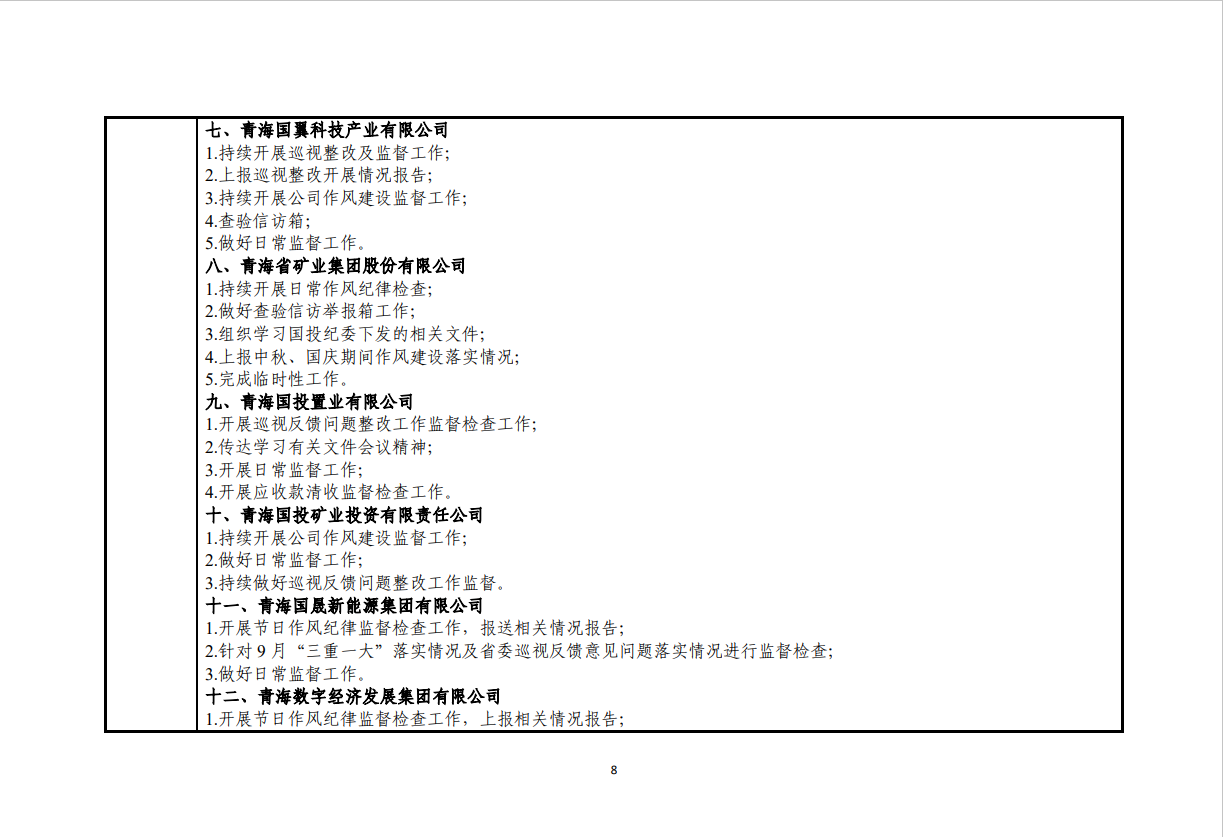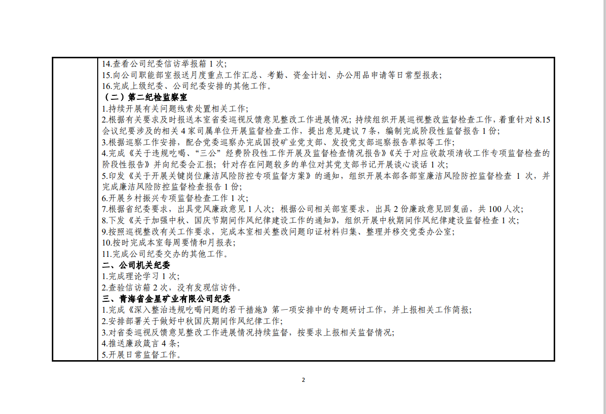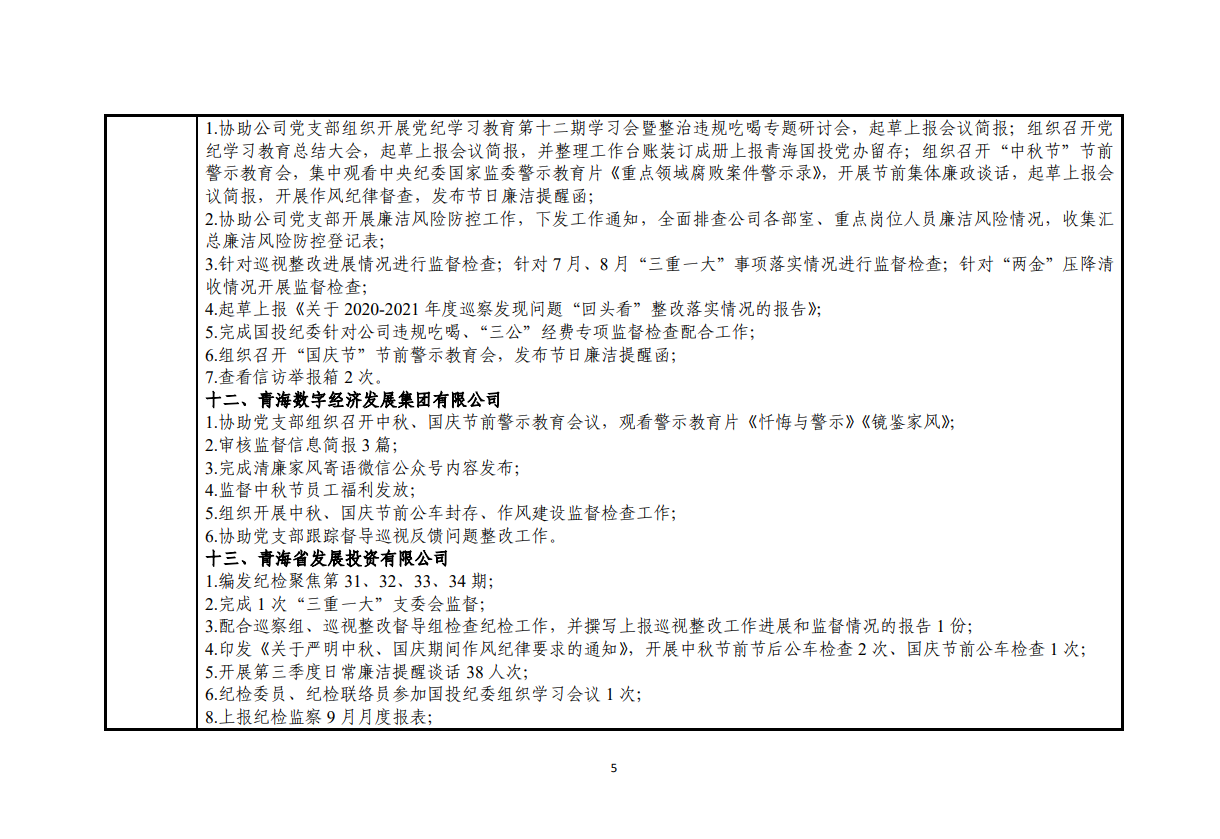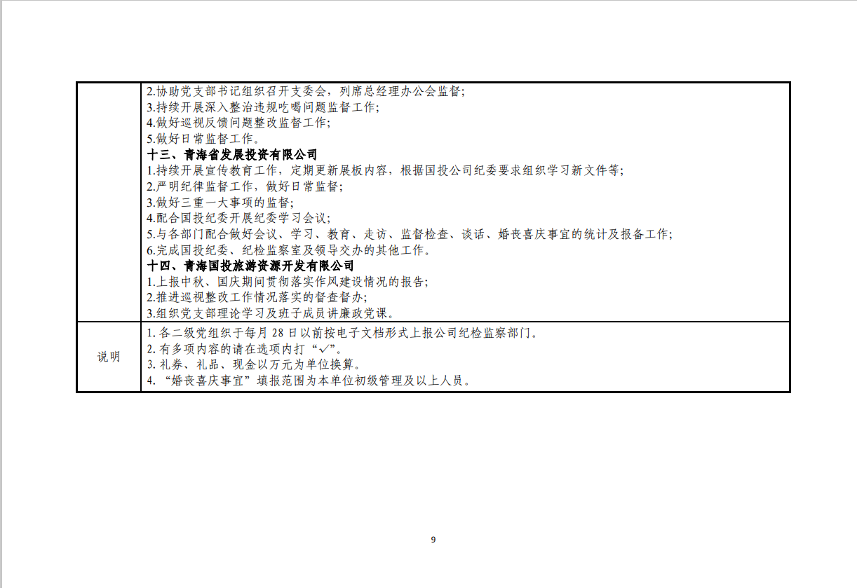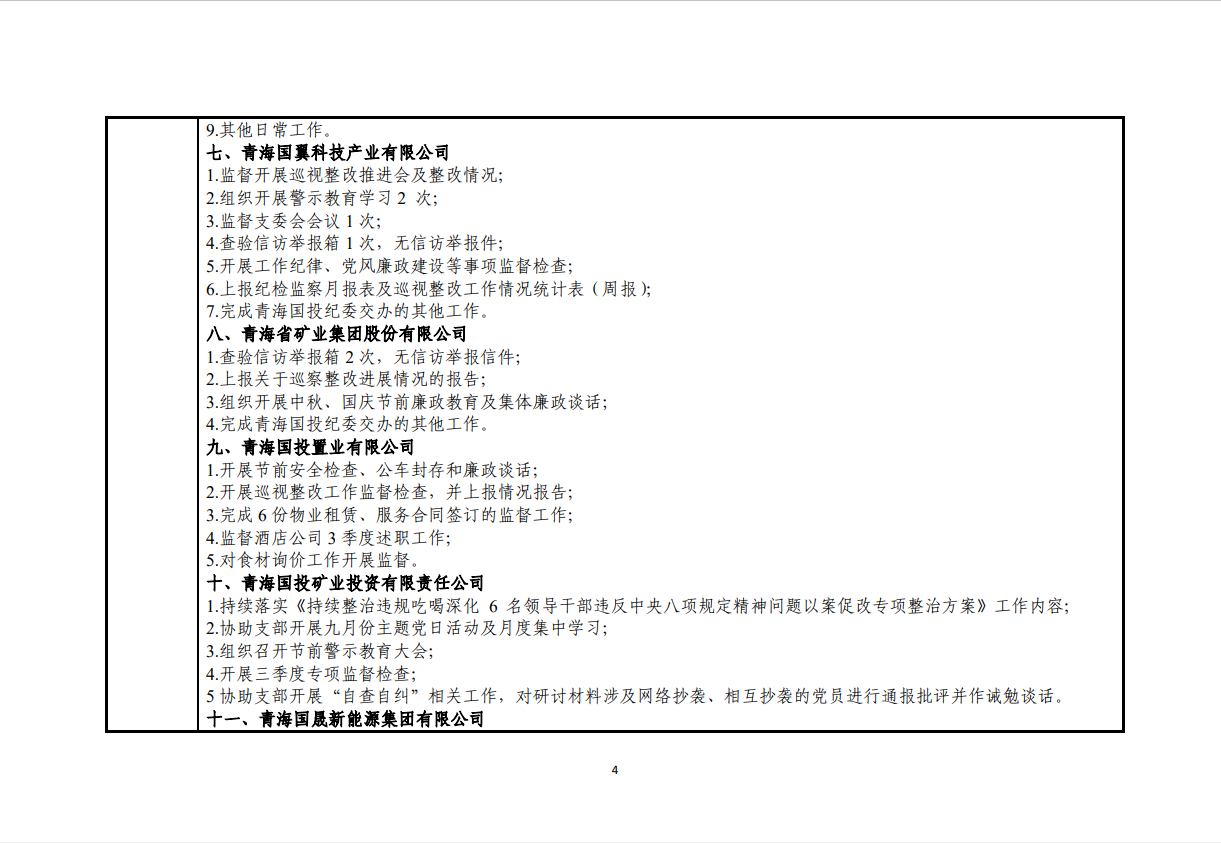 青海国投纪委2024年度纪检监察工作9月份报表